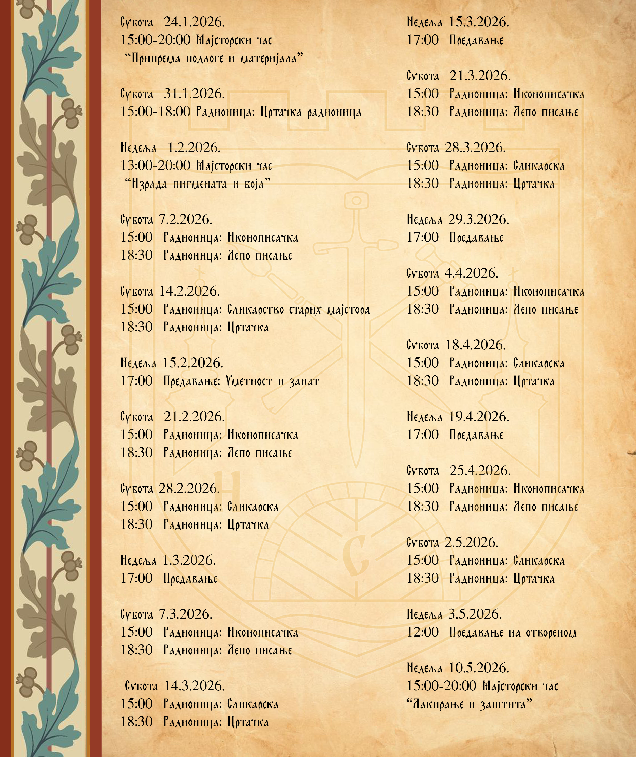 Улаз, вођење кустоса 15 минута, приказ радионица (3 по избору) 45 минута.