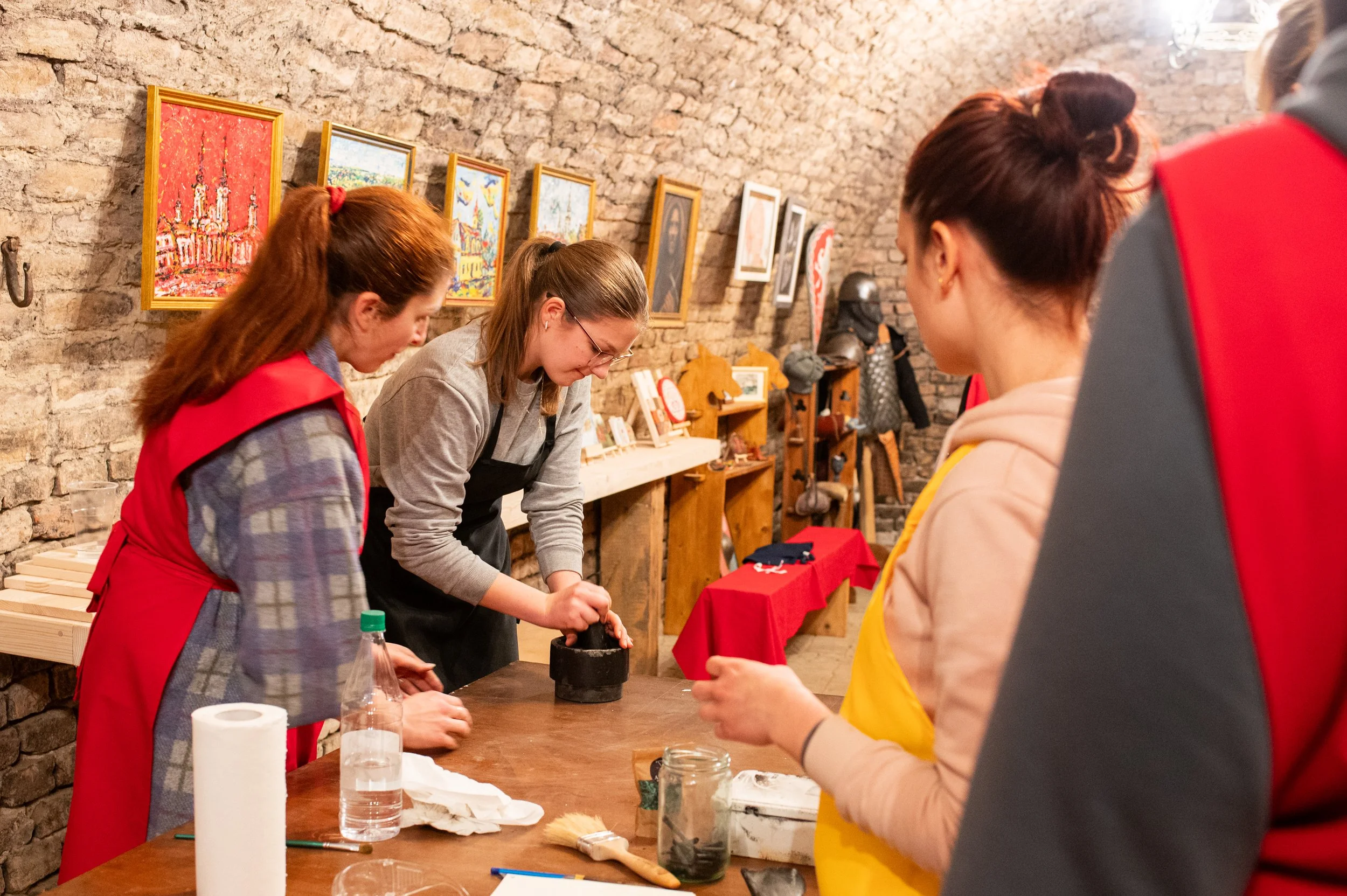 Улаз, вођење кустоса 30 минута, приказ радионица (3 по избору) 15 минута, дегустација вина (3 по избору):