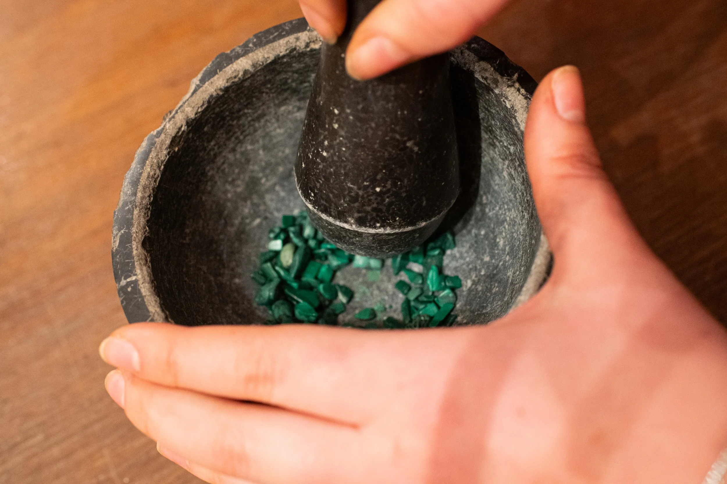 3 сата прављења пигмената (од 7 различитих материјала: 3 земље, камена, кости, угља, малахита.